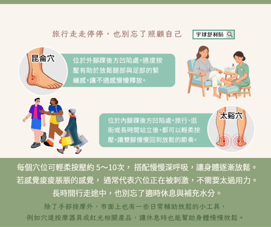 位於外腳踝後方凹陷處(外踝與腳跟之間) 透過輕柔按壓, 有助於讓活動後的雙腳逐漸放鬆, 適合旅行、健行或長時間移動後使用。